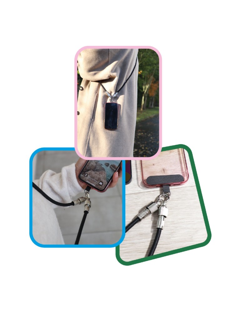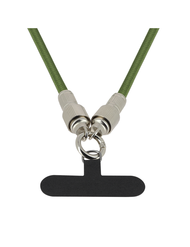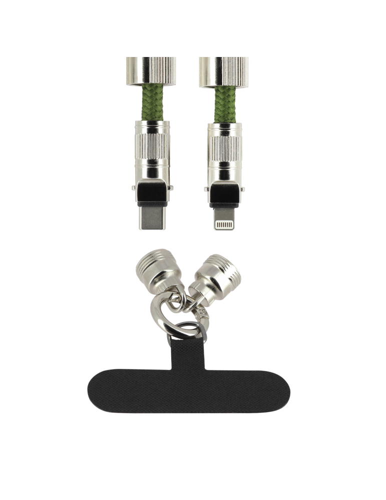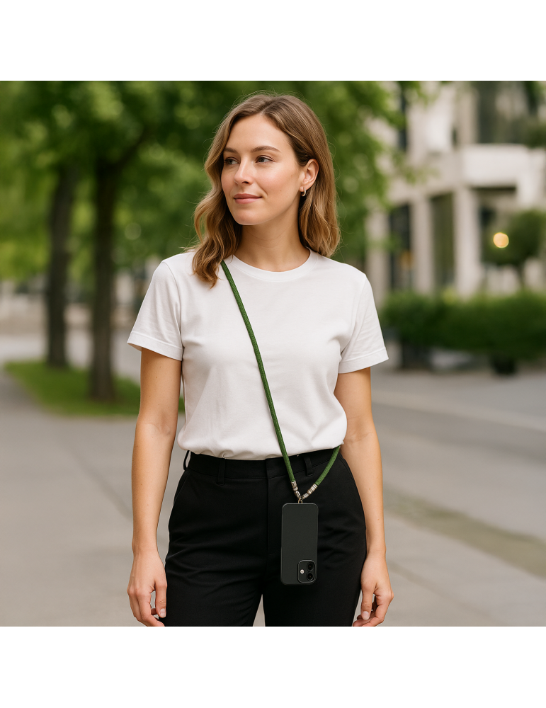 Emportez votre smartphone partout avec style grâce à notre bandoulière Verte avec cordon USB-C / Lightning intégré. Élégante et pratique, elle permet de recharger votre téléphone à tout moment sans câble supplémentaire.
