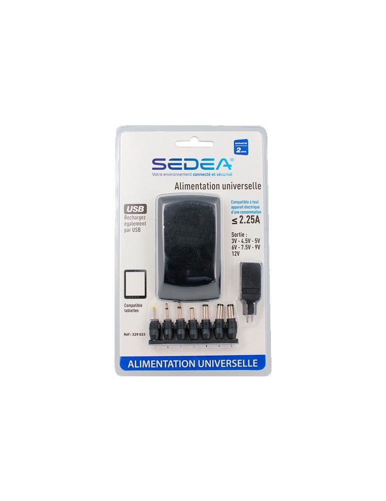 Optez pour une alimentation universelle 2,25 A compatible avec la plupart des appareils électriques, y compris les tablettes. Fournie avec un jeu de connecteurs de sortie, elle garantit une alimentation stable et sécurisée. Selecteur 3V / 4.5V / 5V / 6V / 7.5V / 9V / 12V