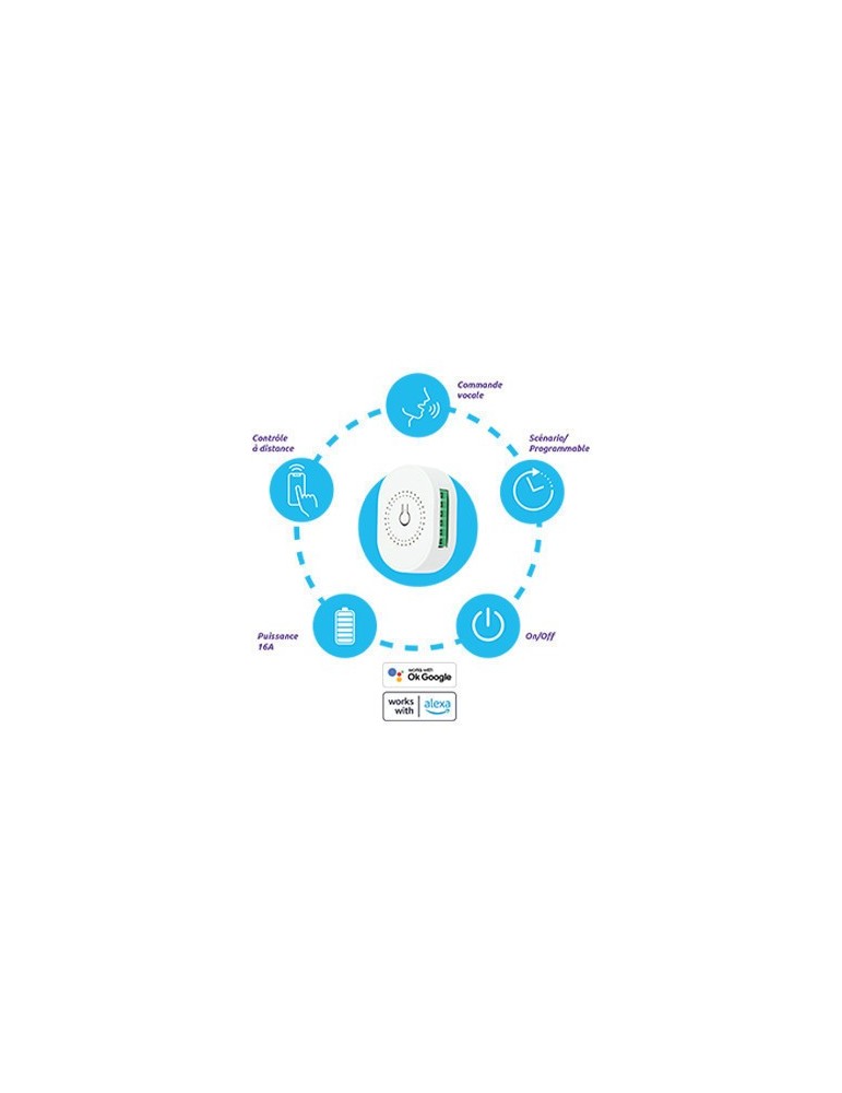Compatible avec Tuya, Google Home et Alexa, ce micromodule on/off Wi-Fi est idéal pour automatiser vos luminaires jusqu'à 2500W. Programmable et discret, il s?intègre dans tous vos projets domotiques.