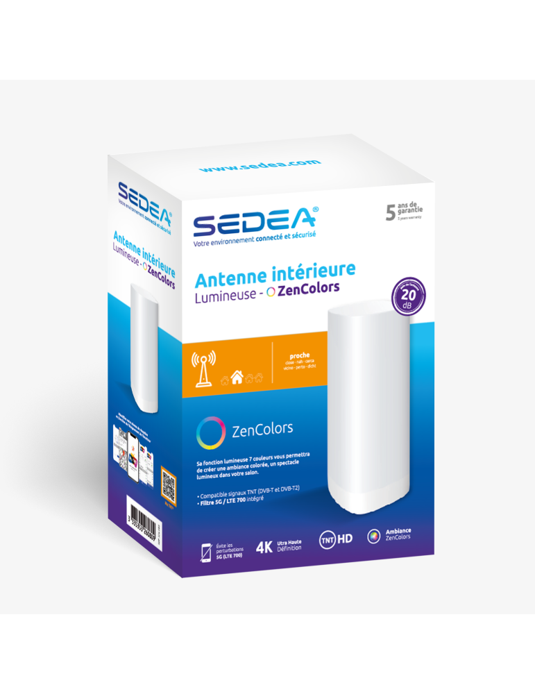 Profitez d?une réception TV parfaite avec l?antenne intérieure TV TNT HD ZenColors. Son design élégant et lumineux avec 7 couleurs s?intègre harmonieusement dans votre intérieur tout en offrant une ambiance unique. Compatible avec la norme NF EN 303354, elle élimine les interférences 5G et garantit une qualité de signal optimale.