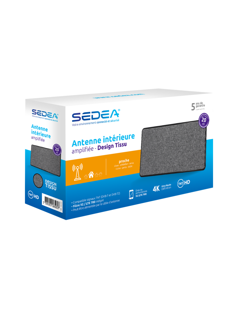 Découvrez notre antenne TV intérieure amplifiée au design élégant en tissu. Optimisée pour la réception des chaînes TNT HD, elle filtre les interférences 4G et 5G pour une qualité d'image exceptionnelle.