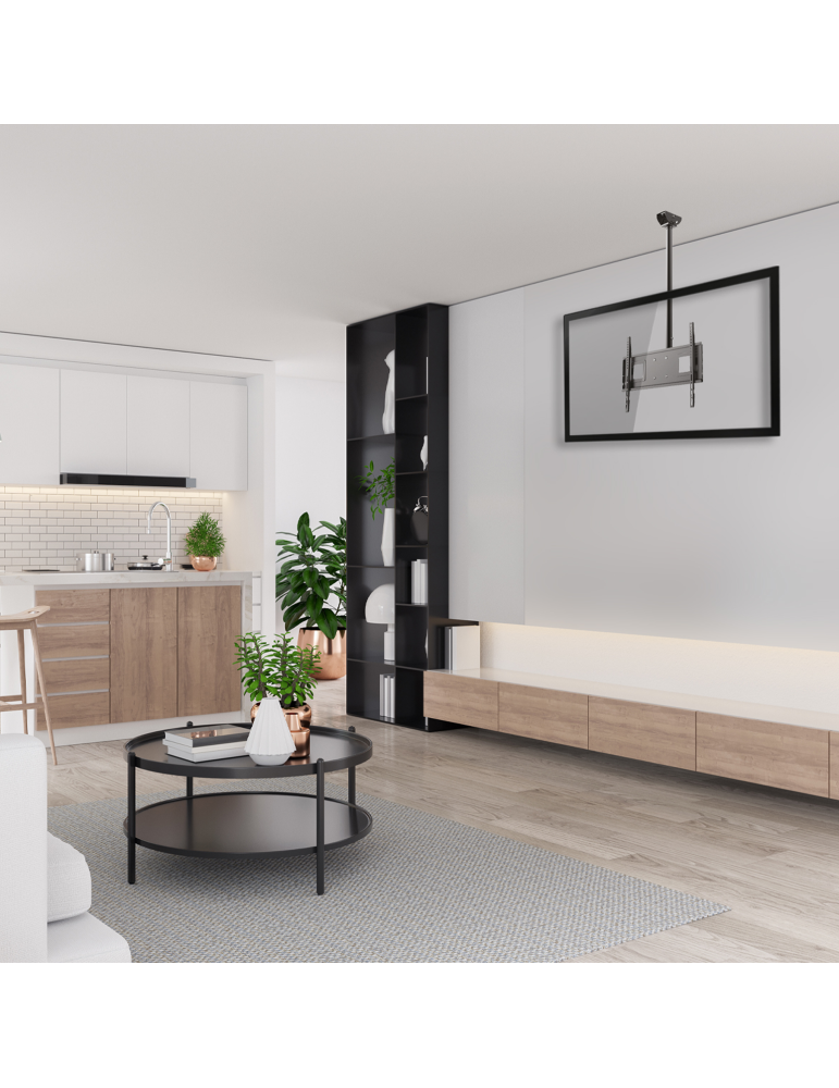 Découvrez le support TV plafond ajustable, idéal pour les écrans de 32 à 70'' (80 à 178 cm). Sa hauteur réglable de 910 à 1510 mm, son inclinaison de -2 à 15° et sa compatibilité VESA 200x200 à 600x400 assurent une installation personnalisée.